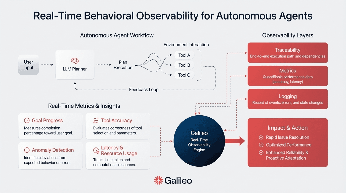 Behavioral observability instruments your agent decision processes themselves, capturing tool selection rationale, reasoning traces, and state transitions. Comprehensive observability requires logging for decision capture, metrics for performance indicators, and tracing with spans for execution flow visualization. Platforms like Galileo's Insights Engine enable this through automated failure pattern detection across thousands of your agent workflows.
