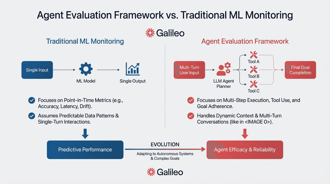 Agent evaluation frameworks measure multi-step autonomous behavior, tool orchestration, and trajectory-level analysis rather than single-inference prediction quality. According to Galileo's AI Agent Measurement Guide, agent platforms capture tool selection logic, plan quality, context retention across long interactions, and safety boundary adherence that traditional monitoring completely misses.