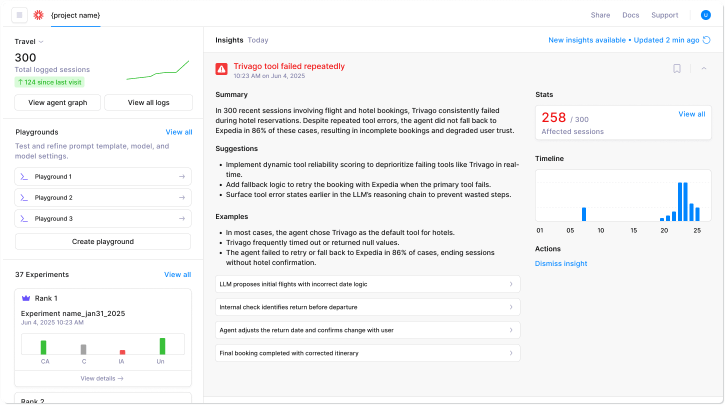 Once you spot an anomaly, multi-turn session metrics reveal how errors propagate across steps, capturing latency, token usage, and tool success rates for entire dialogues. Likewise, the Insights Engine automatically clusters failures, highlights hallucinations, and flags broken RAG citations at the chunk level—eliminating manual log scrubbing.