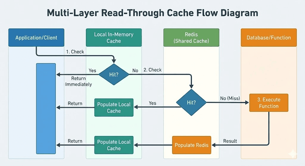 Multi-layer read-through cache — Local in-memory + Redis. Most repeated reads hit the local cache and never touch the network.