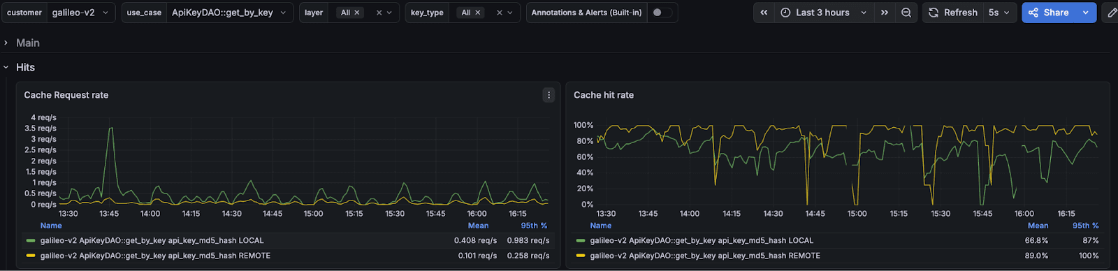 GCache exports Prometheus metrics out of the box, all labeled by use case, layer, and key type. You can finally answer the questions that actually matter: