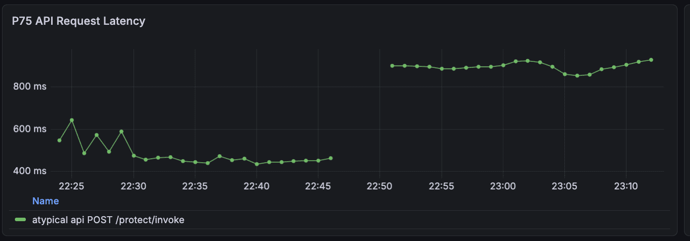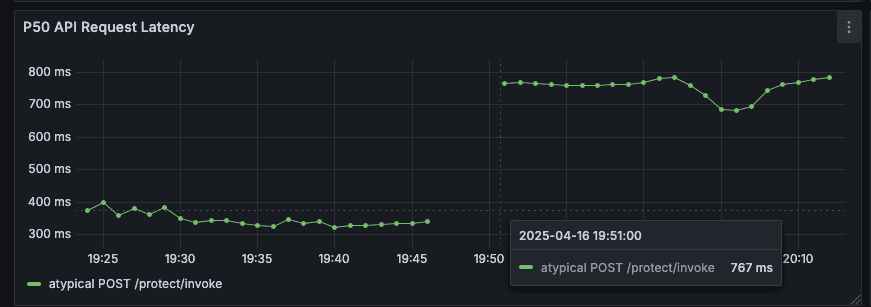 One of our highest-traffic endpoints is /protect/invoke, part of our core product offering that provides real-time guardrails for AI applications. We noticed latency creeping up and used our function metrics dashboard to find the bottleneck.