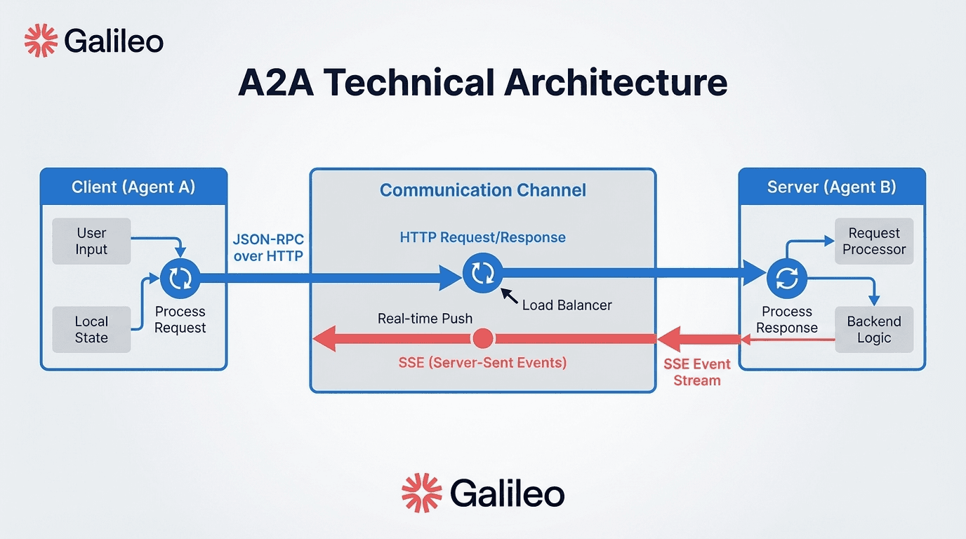 A2A builds on standards your teams already understand rather than introducing proprietary protocols. The architecture uses JSON-RPC 2.0 over HTTP/HTTPS for request-response patterns and Server-Sent Events (SSE) for real-time streaming, providing language-agnostic integration with standard web security through TLS.