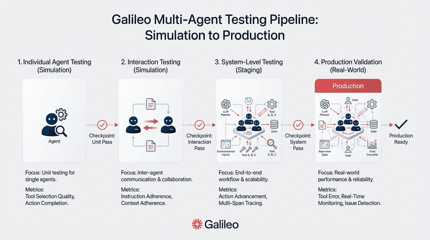 Your individual agent testing validates each agent's core capabilities. Your interaction testing assesses agent-to-agent communication. Your system-level testing includes end-to-end workflow validation with stress testing and chaos engineering that simulates production conditions.