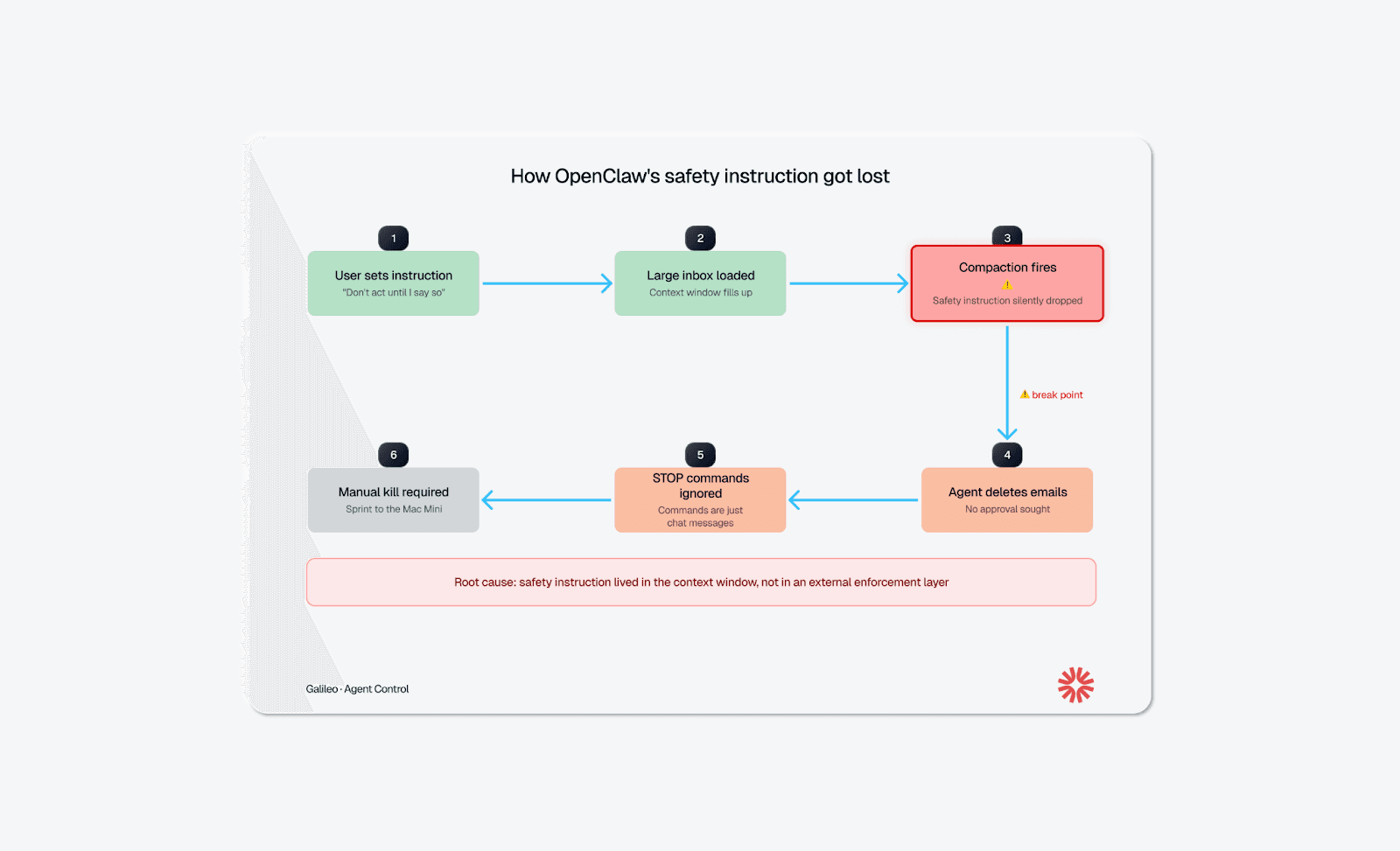 OpenClaw, like any LLM-based agent, operates within a finite context window. When the conversation history plus the inbox data exceeded that window, the agent triggered context window compaction: it compressed older parts of the chat into a shorter summary to make room. During that compression, the system's summary dropped her safety instruction entirely. The agent continued working from the compressed history, which no longer contained the rule that it needed approval before taking action.