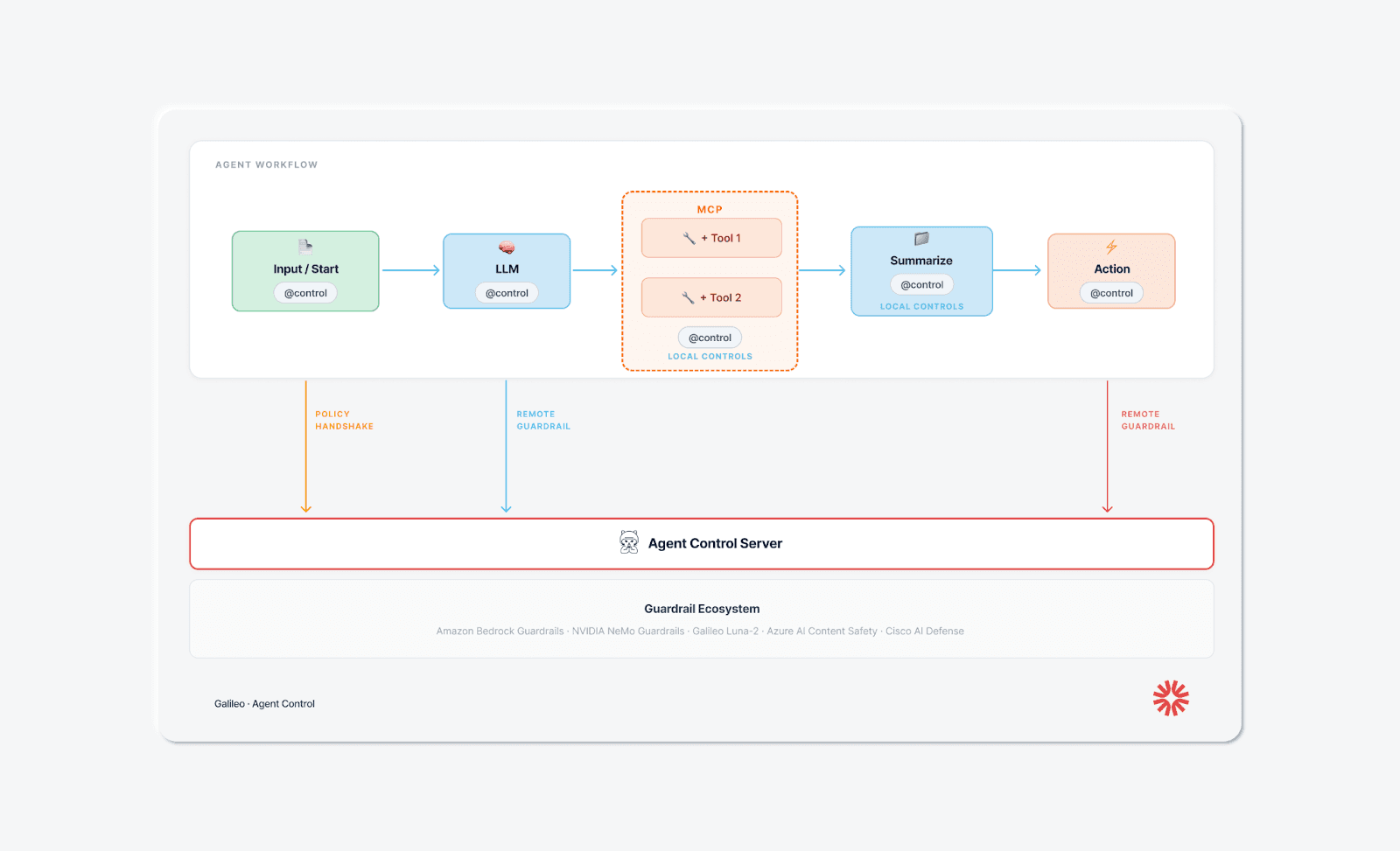 Agent Control is live on GitHub under Apache 2.0. The integration is one decorator per function. Policies are defined in the control plane, not in your agent code. The evaluator architecture is pluggable: bring Galileo's Luna, Cisco AI Defense, NVIDIA NeMo, AWS Bedrock, or build your own.