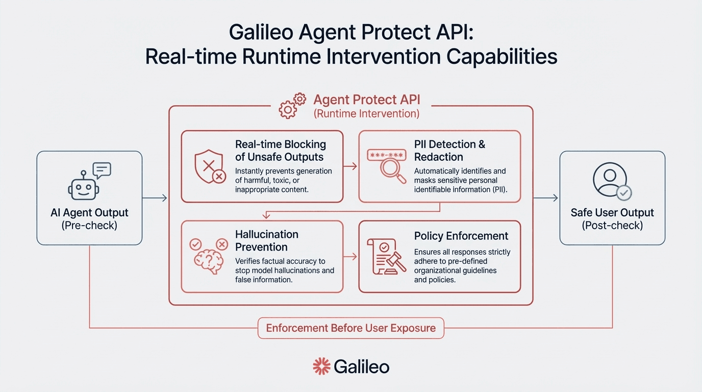 Agent Protect API delivering deterministic override and passthrough actions enabling real-time blocking of unsafe outputs, PII detection and redaction, hallucination prevention through fact-checking, and policy enforcement before actions reach users