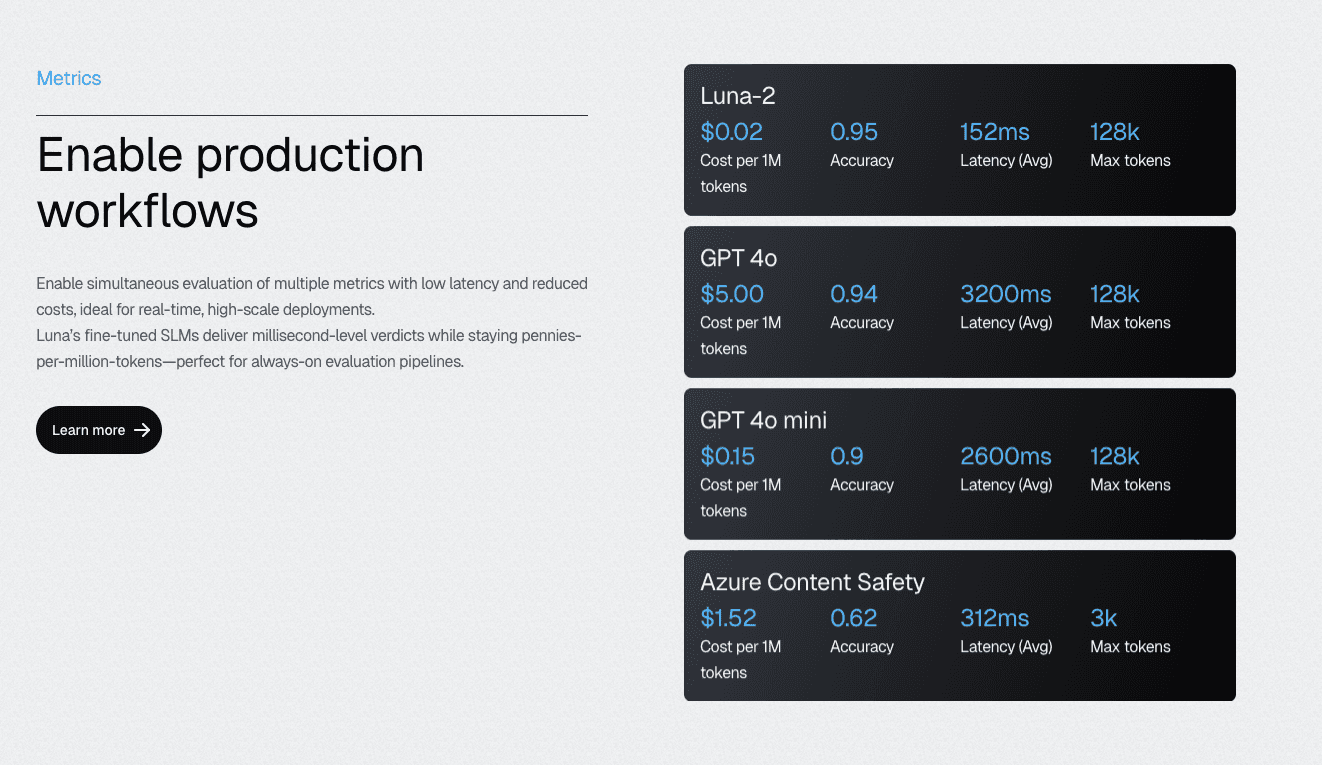 Continuous Learning via Human Feedback further extends Luna-2’s value. Evaluators adapt to your specific domain, quality standards, and edge cases based on as few as 2-5 human feedback examples. This transforms weeks of custom metric development into minutes of configuration. As your agents evolve, your evaluation models evolve with them.
