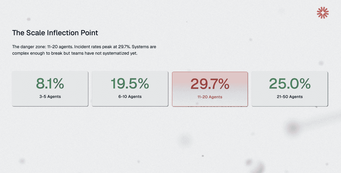 As AI architectures mature from simple chatbots to complex, multi-agent workflows, incident rates spike. Our data shows that teams running 11-20 agents experience peak incident rates of nearly 30%.