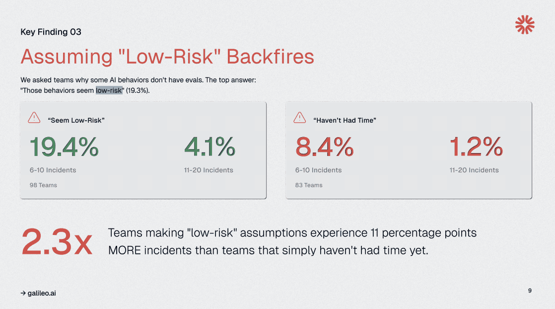 One of the most dangerous assumptions in AI engineering is the "low risk" label. Our survey shows that 19.3% of teams skip evaluations for behaviors they deem simple, only to experience 2.3x more incidents.