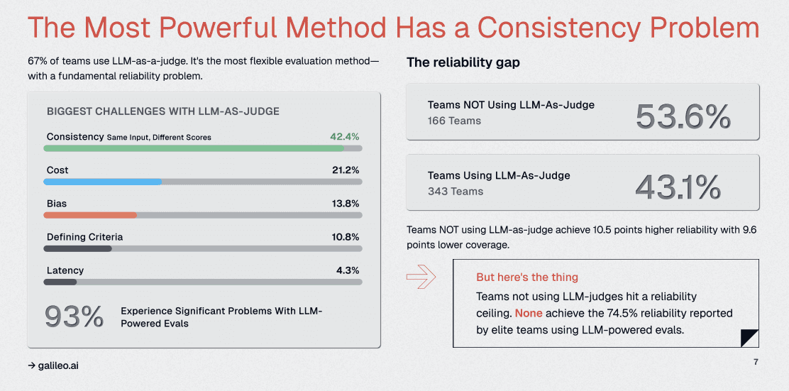 Our research highlights a critical vulnerability: 67% of teams use LLMs as judges, but 93% of those teams report significant problems, primarily related to consistency (42.4%).