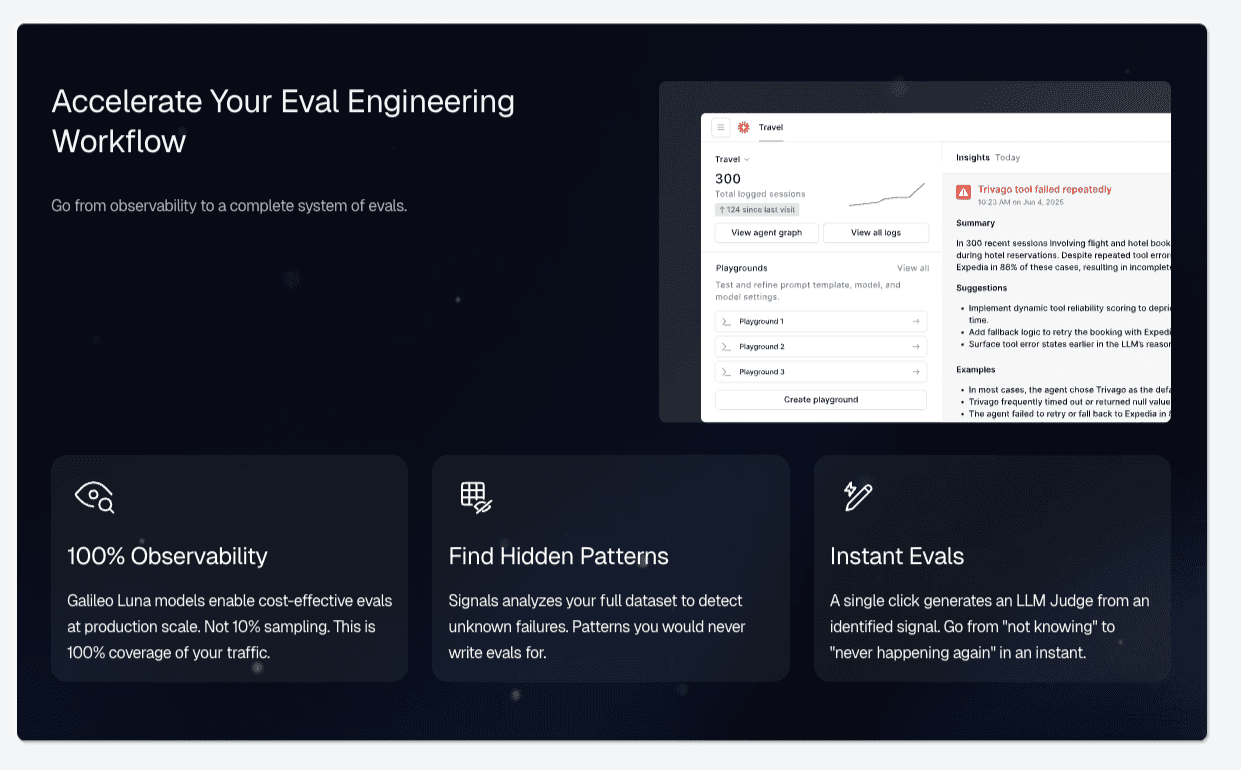 Automated Failure Detection via Signals: Rather than waiting for production incidents to reveal evaluation gaps, Galileo's Signals automatically surfaces failure patterns across agent traces