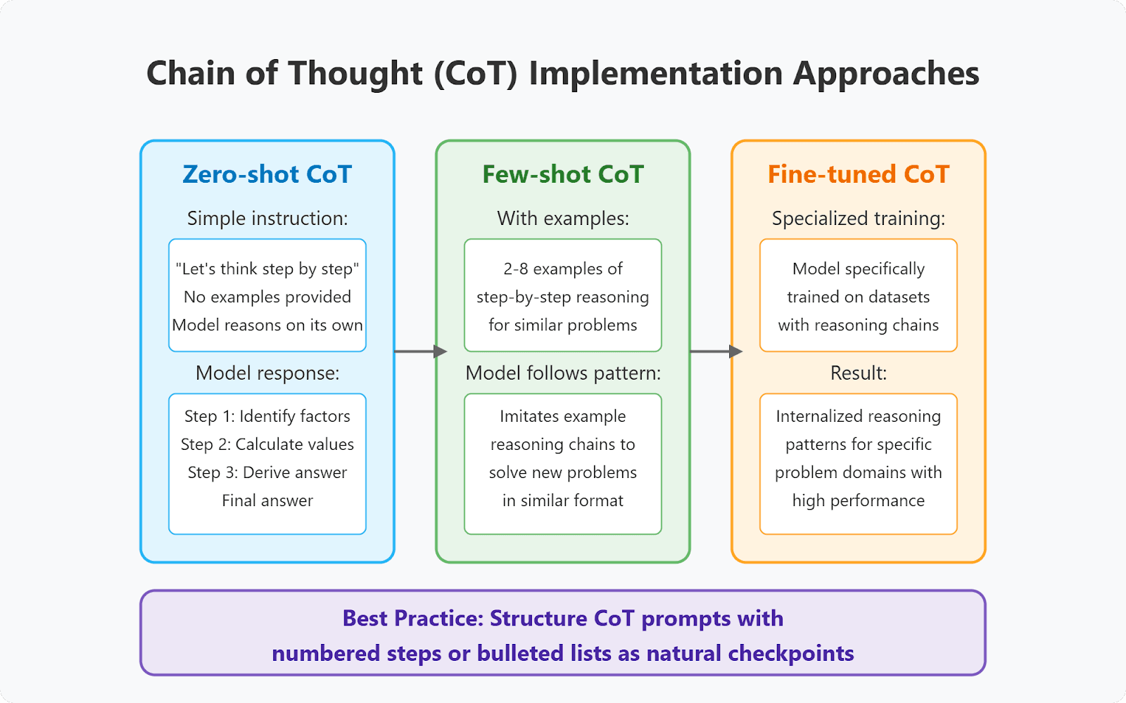 Three primary approaches exist for CoT implementation: zero-shot, few-shot, and fine-tuned methods: