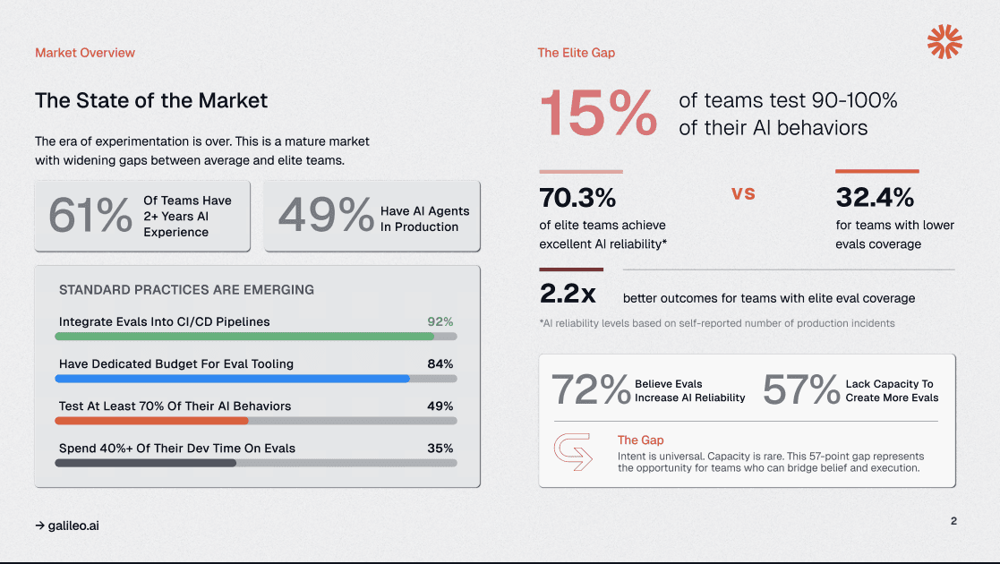 1. Elite Teams Achieve 90–100% Eval Coverage and 70.3% Excellent Reliability