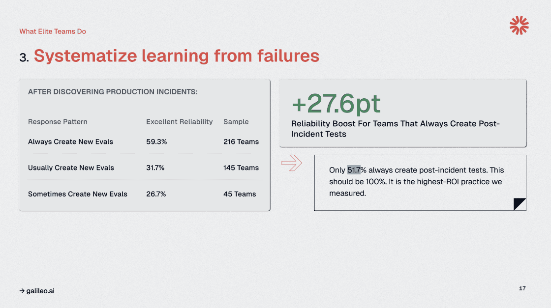 Only 51.7% of teams consistently create evaluations after production incidents. The difference between reactive incident response and systematic improvement lies in transforming every failure into a permanent regression test, thereby compounding quality gains that prevent recurrence.
