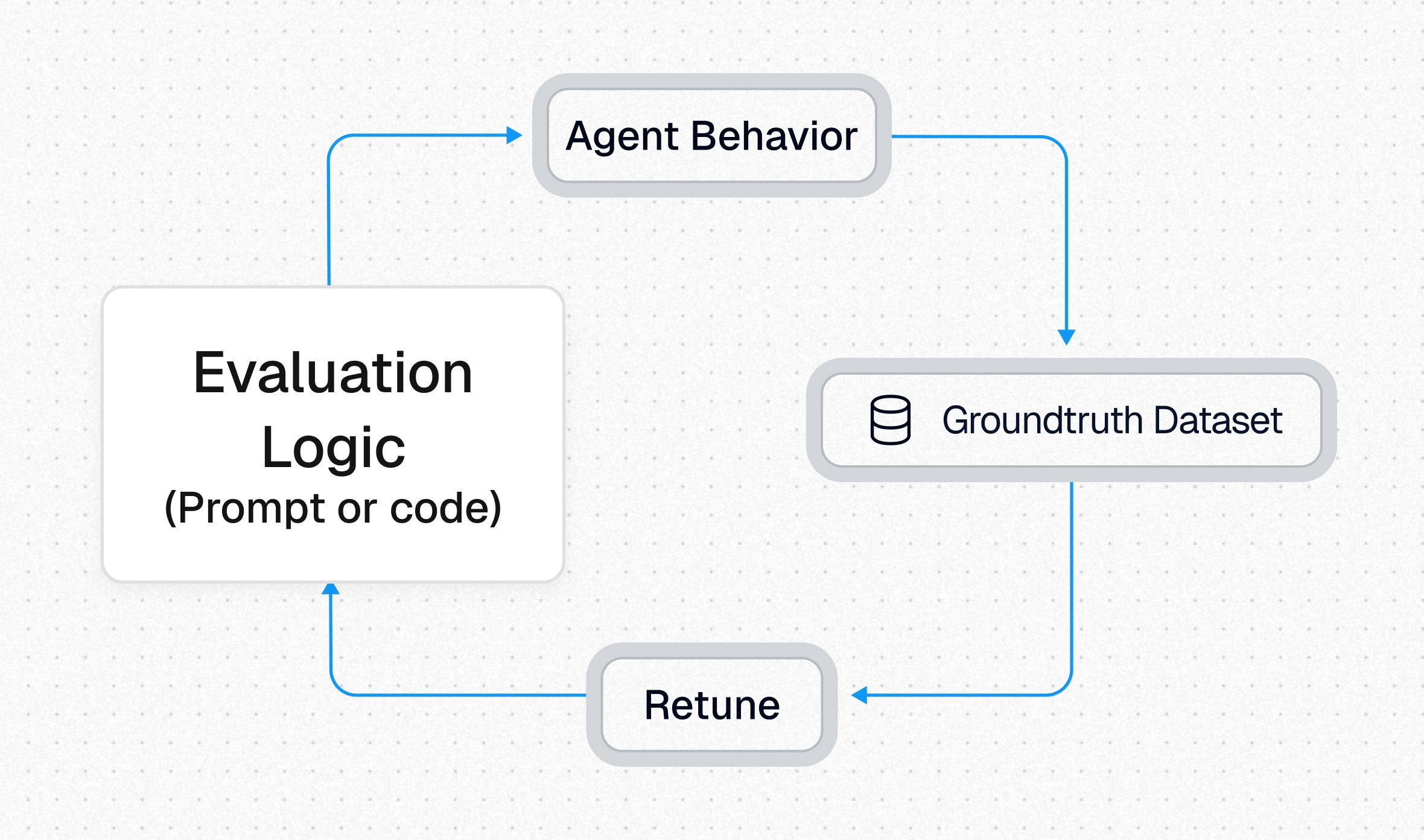 An eval is only as good as its tuning. Without this, industry research suggests LLM-based evals achieve approximately 66%-68% agreement with human subject matter experts at best. Tuning is achieved via the following process: