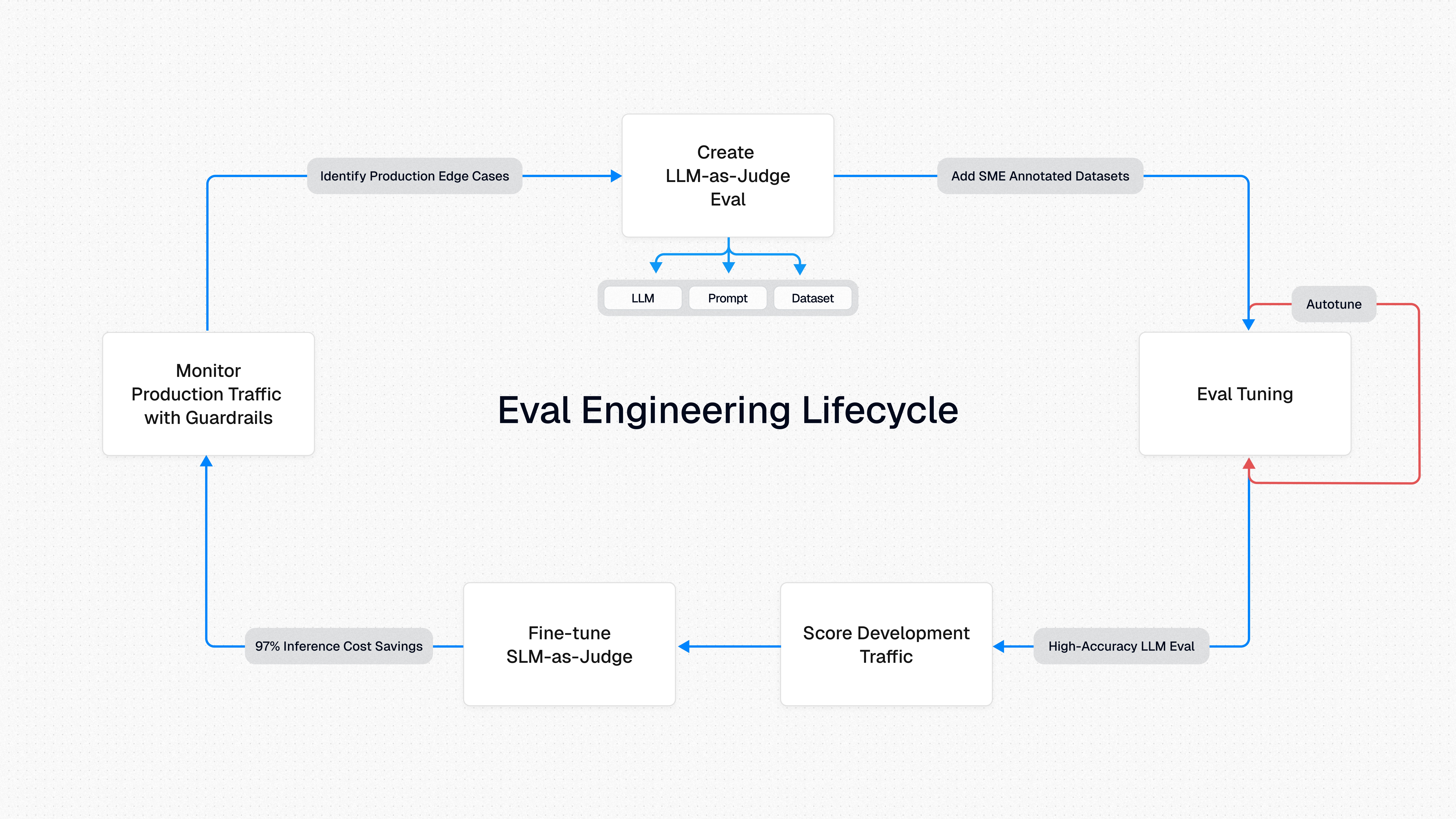 Eval engineering follows the entire lifecycle of an eval, from creating the initial LLM-as-a-judge prompt to deploying it as a production guardrail. Each phase has its unique challenges. The Galileo platform was designed to accelerate each phase of this lifecycle.