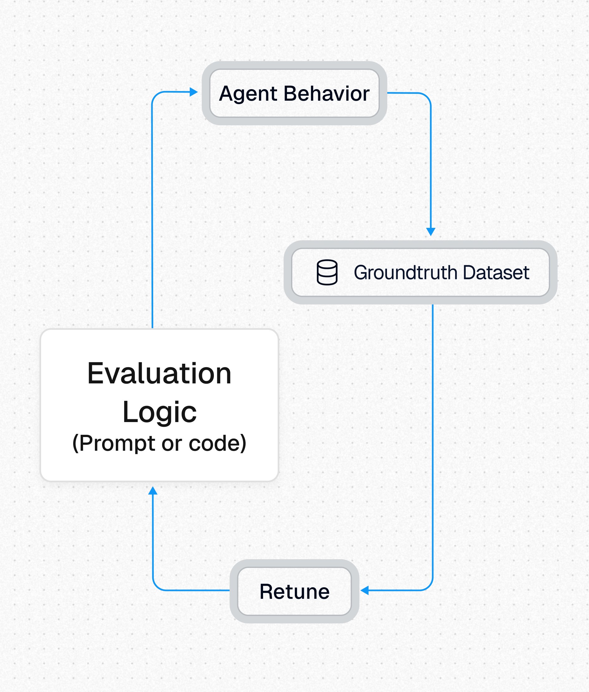 The process starts when you identify an eval required to track a desired behavior from your agent or LLM-system. This eval can be code-based, an off-the-shelf LLM judge from an open source library, or something entirely bespoke for your use case.