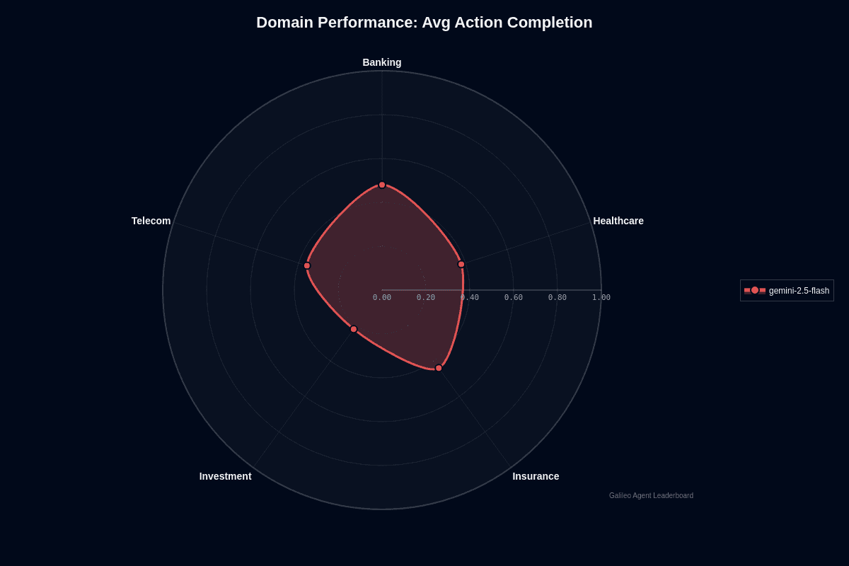 Gemini-2.5-flash shows clear domain variance in action completion. Banking leads at 0.48, followed by insurance at 0.44, healthcare at 0.38, telecom at 0.36, and investment trailing at 0.22.
