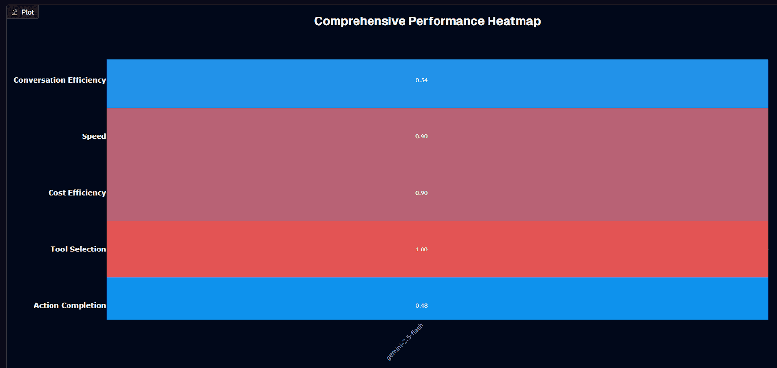 Gemini-2.5-flash delivers its strongest performance in tool selection, scoring a perfect 1.00. Speed and cost efficiency both hit 0.90, confirming the model's positioning as a budget-friendly, high-throughput option. Conversation efficiency lands at 0.54, while action completion settles at 0.48—just below the halfway mark.
