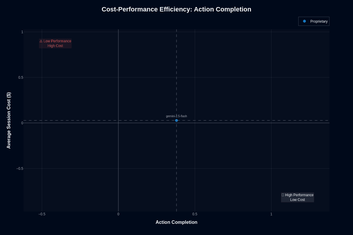 This scatter plot positions Gemini-2.5-flash at approximately (0.48, $0.03)—just left of center on the action completion axis while hugging the cost baseline. The model avoids the "Low Performance High Cost" danger zone in the upper left but falls short of the ideal "High Performance Low Cost" quadrant in the lower right.