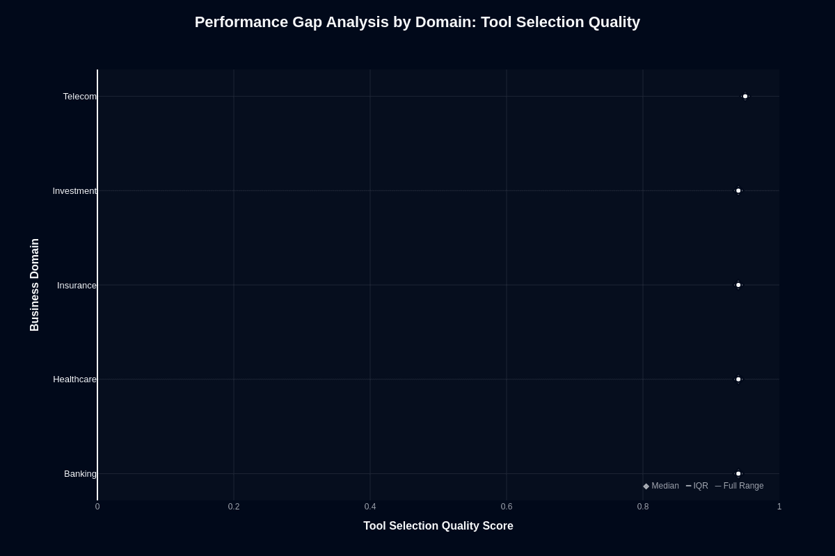 In contrast to action completion's variance, tool selection quality shows remarkable consistency. All domain medians cluster between 0.95 and 0.98. Healthcare and telecom edge toward 0.98, insurance and investment land near 0.96–0.97, and banking sits around 0.95.