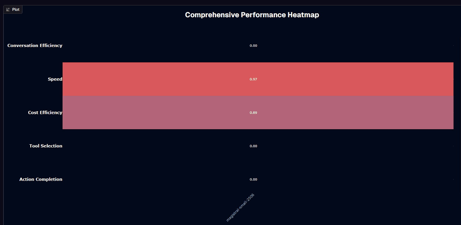 Speed is where Magistral Small 2506 shines. A 0.97 speed score places it in the 97th percentile—17.4 seconds average response time. Stack that with a 0.89 cost-efficiency score at $0.03 per session. The result: answers delivered almost instantly without draining your budget. For latency-sensitive, high-volume workloads, those two numbers are hard to beat.