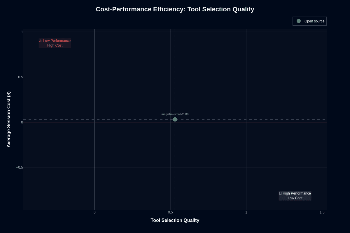 How dramatically does the equation change when your task involves simply picking the right tool? Here, performance edges toward borderline usability. There is currently no published tool-selection latency or score reported for Magistral Small 2506 in the available benchmarks, so any claim of a 17.4-second latency or a 0.53 tool-selection score is not supported by existing evidence.