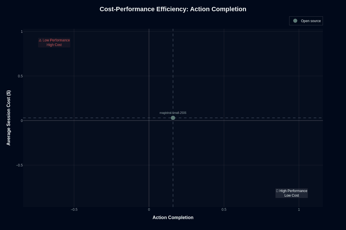 Magistral Small 2506 sits at #22 on the Agent Leaderboard with a speed score of 0.97 and cost efficiency of 0.89. Translation: near-instant responses at $0.03 per session. For engineering leaders obsessed with cost-performance ratios, those numbers look tempting.
