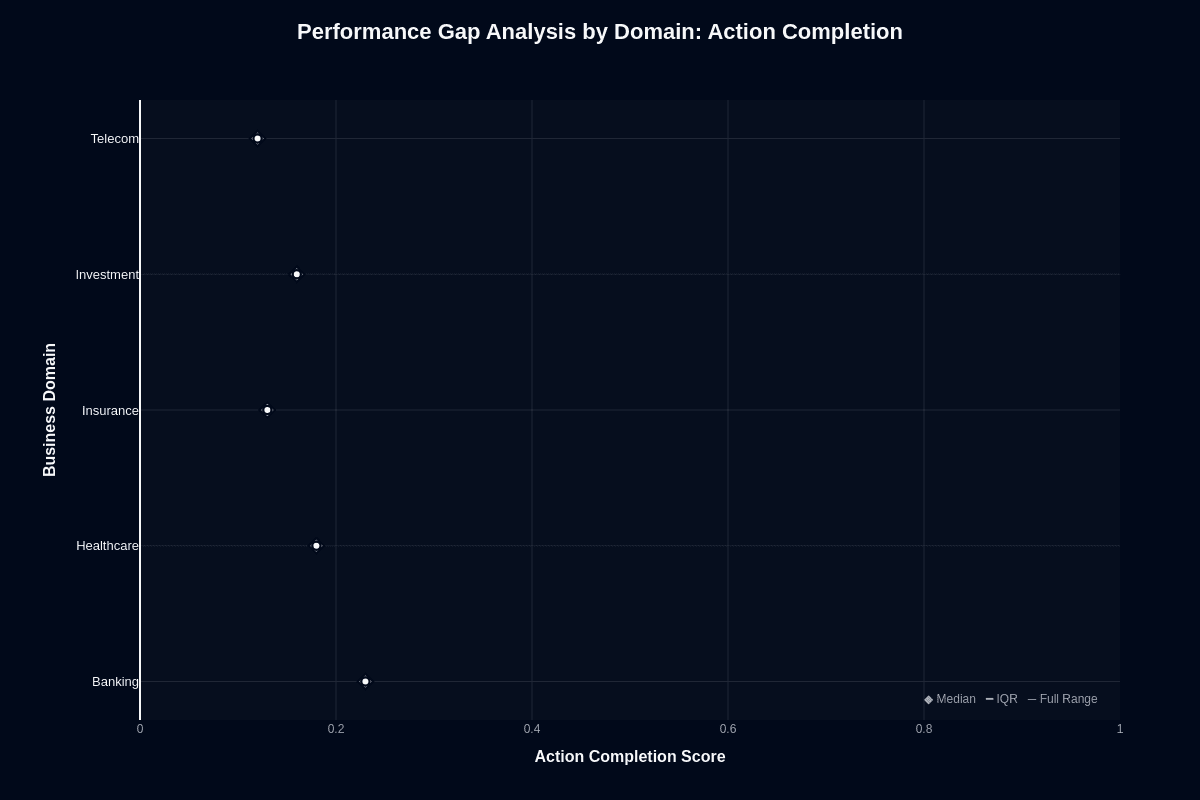 Insurance (0.13) and Investment (0.16) reveal the model's brittleness. Both domains overload prompts with conditional logic—exclusions, riders, hedging language. This demands precise multi-step reasoning. The system starts strong, selects plausible sub-tasks, then stalls when rules collide. Telecom exposes the weakest point entirely. Network provisioning tickets draw on acronyms, proprietary configuration strings, and rapidly changing service catalogs. At a 0.12 success rate, eight of ten automated actions still fail despite speed advantages.
