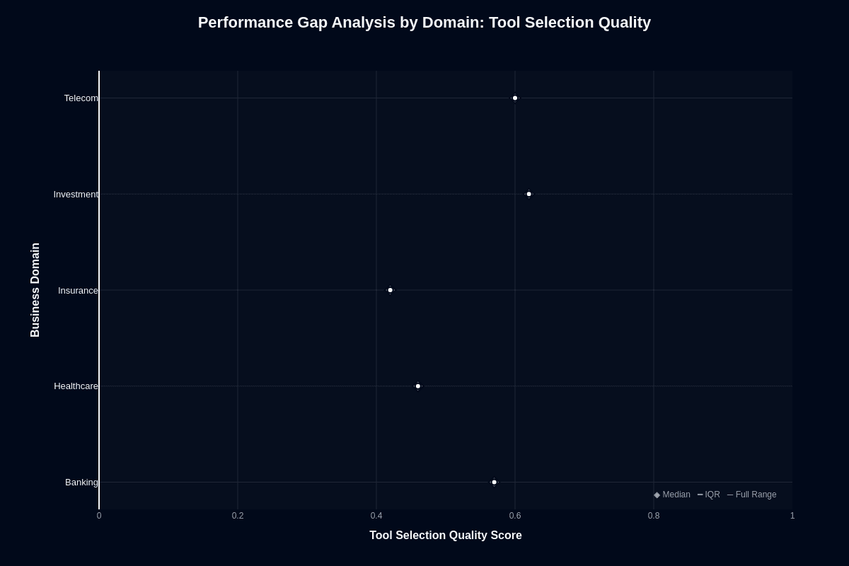Tool selection by domain further illustrates these disparities. The median tool selection rates show that Investment and Telecom excel at 0.67, while Banking follows closely at 0.63. Healthcare lags at 0.53, and Insurance falls significantly short at 0.43. There's a notable inversion where Telecom, despite low action completion, performs well in tool selection. This suggests that while the model can select tools correctly, it falters in executing related tasks.
