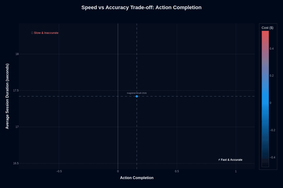 You rarely have the luxury of waiting for a model to think. This 24B parameter model delivers responses in roughly 17 seconds while keeping per-session cost around $0.03. The reality is sobering: its 0.16 action-completion score means most multi-step tasks still fail. Understanding this speed-accuracy trade-off determines whether rapid turnaround can offset significant performance gaps in your specific workload.