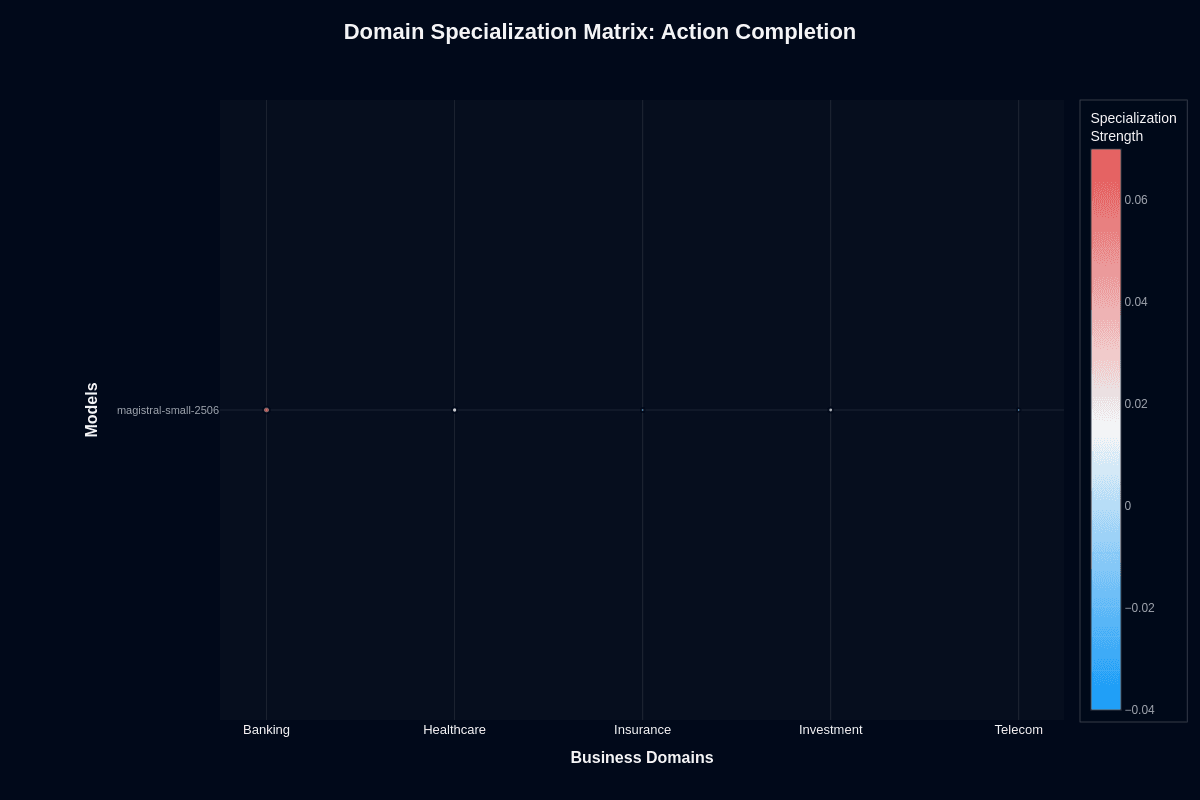 Scan the radar chart and one pattern jumps out: Banking stretches farthest from the center at a 0.23 action-completion score. Telecom barely registers at 0.12. That near-two-fold gap defines how you should approach this model's vertical aptitude. It simply handles structured, transaction-heavy workflows better than looser, jargon-dense conversations.