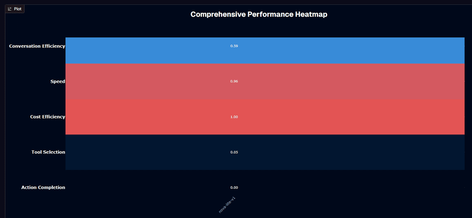 The critical gaps emerge in functional metrics where Nova Lite V1 struggles significantly. Action completion registers at just 0.160—meaning fewer than two out of ten tasks succeed on first attempt. Tool selection accuracy sits at 0.550, barely above random chance for most use cases. The normalized heatmap values paint an even starker picture: 0.00 for action completion and 0.05 for tool selection indicate severe underperformance on the metrics that matter most for autonomous agent workflows.