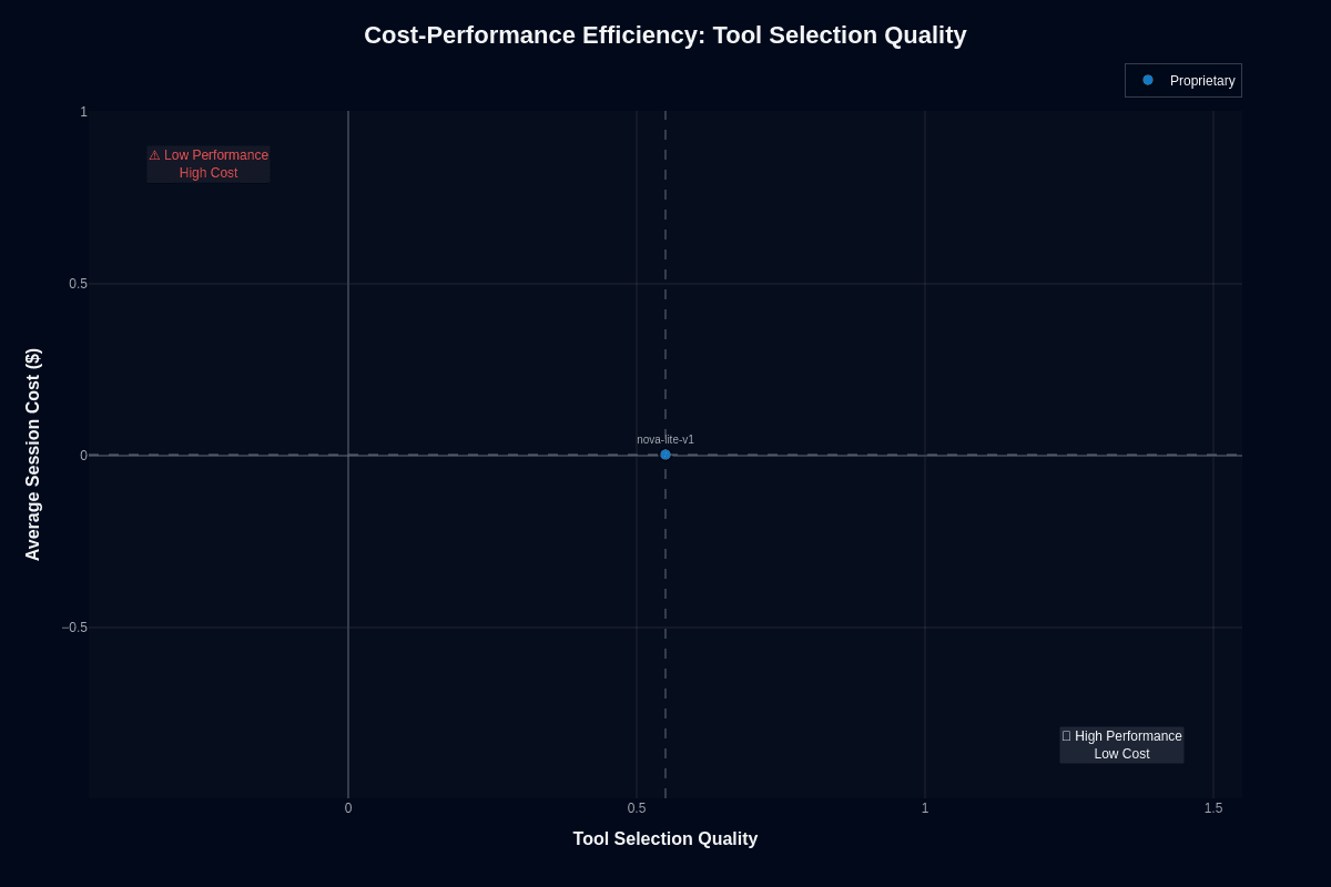 For simple routing tasks where slight deviations from random accuracy are tolerable, Nova Lite V1 is unbeatable on cost. Critical tool routes will need validation layers or a combination with higher-accuracy models. Integration with AWS and cost-effective positioning against models like GPT-4o mini makes it an economical option within the AWS ecosystem. Should 45% tool selection errors prove unacceptable, upgrading to Nova Pro or alternatives may be necessary despite higher costs.