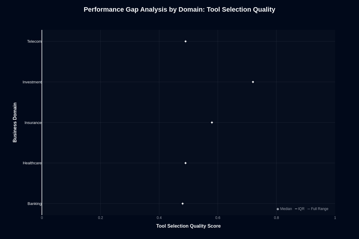 Investment achieves an unexpected 0.77 median, dwarfing Banking's random-walk 0.50 performance and leaving Healthcare and Telecom only marginally better at 0.53. Insurance occupies the middle territory at 0.63. This 27-point spread means Investment requests succeed more than 1.5 times as often as Banking requests—a difference that surfaces immediately in production telemetry and user experience metrics.