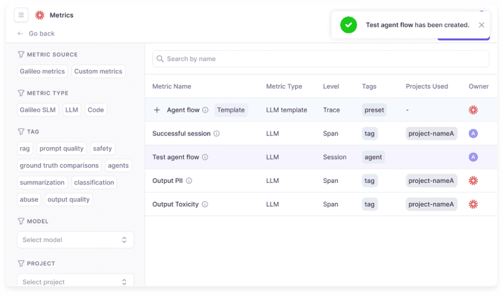 Galileo's Metric Store with CLHF (Continuous Learning from Human Feedback) enables you to build once, refine with human feedback, and deploy across all your projects. One team's "hallucination detector" becomes the entire organization's standard, with version control and refinement built in.